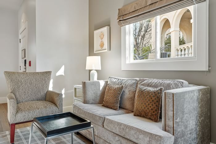 Measuring 550 square feet, our Cottage Suite features a bedroom with one King bed, a fireplace and private patio and a separate living room with a sofa bed. This suite accommodates up to four guests.